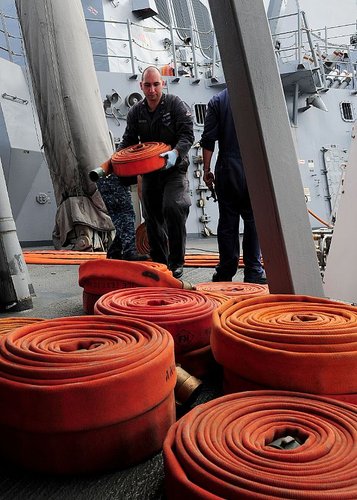 當備戰警報一響,修理班關閉水密門後,接下來就是依照個人部署取用與穿戴裝備後到損管中心集合待命。我們通常是由滅火操演開始,接下來的操演內容則看損管官安排,滅火與堵漏操演都是必有的內容。滅火與堵漏操演每個新兵在新訓中心都學過基本功,船上的修理班操演只是更專精一些。堵漏我只依稀還記得堵漏板要先抵住艙壁,然後由上而下移堵住破洞後再用支架撐住。如果艙壁出現裂痕,要先在裂痕兩端鑽洞再行處理,以免裂痕持續漫延。
